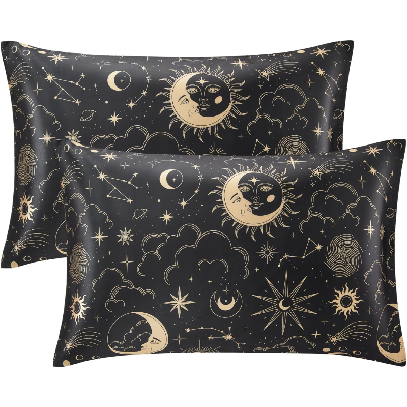 Elevate your home decor with our exquisite black printed silk pillow covers, featuring a stunning design of moons and stars in a luxurious gold hue. These two pillow covers not only provide a touch of elegance to your living space but also offer the soft, smooth texture that silk is renowned for, ensuring a comfortable and stylish addition to your bedding or decorative pillows.
